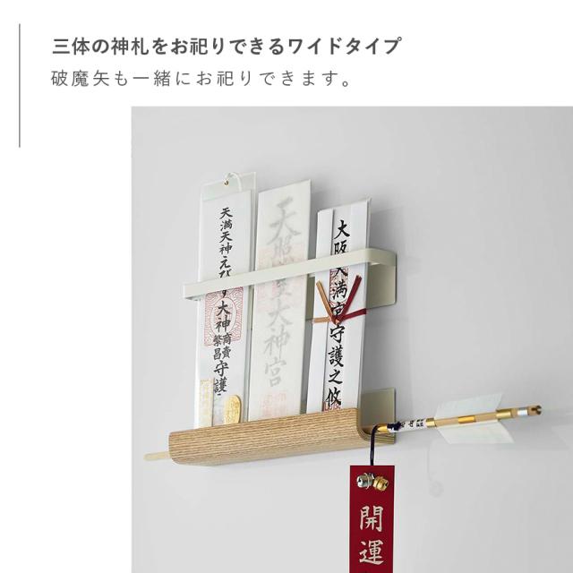 横に三体の神札を並べて、破魔矢もお祀りできるワイドタイプ。