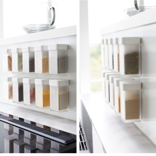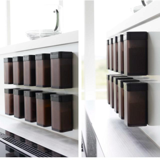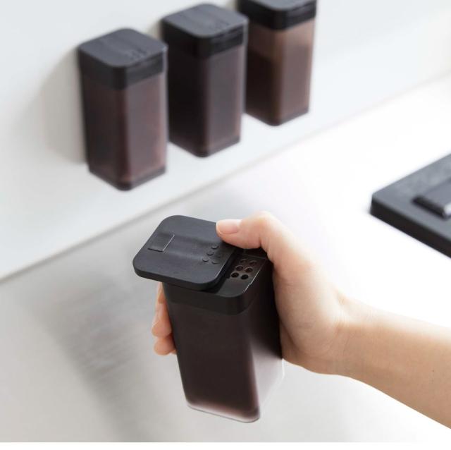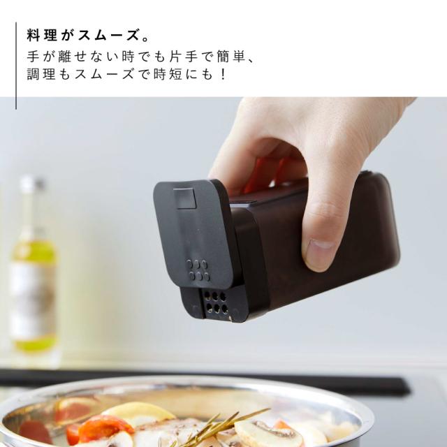 使いたい量が片手で調節できる!ラージサイズ、マグネット設置が便利な調味料保存容器。前後にフタをスライドさせ、使いたい分量を選んで出すことができます。片手で操作できるので、調理もスムーズで時短にも!
