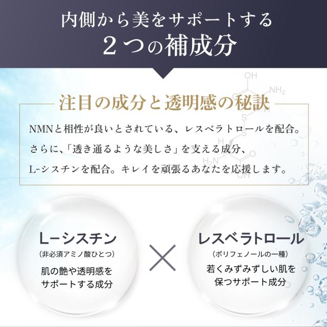 NMNと相性の良いレスベラトロール、 L-シスチンも配合しております。