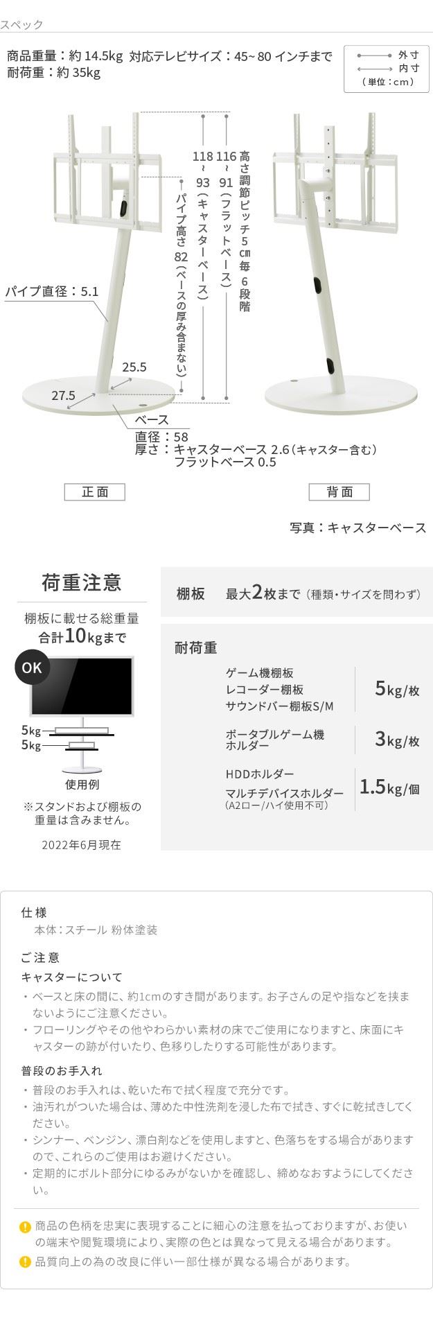 ベースサイズ:直径58cm・厚み26mm(キャスター含む)