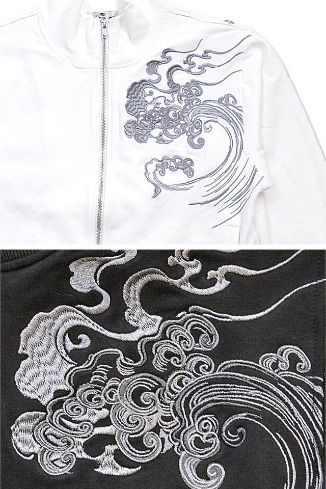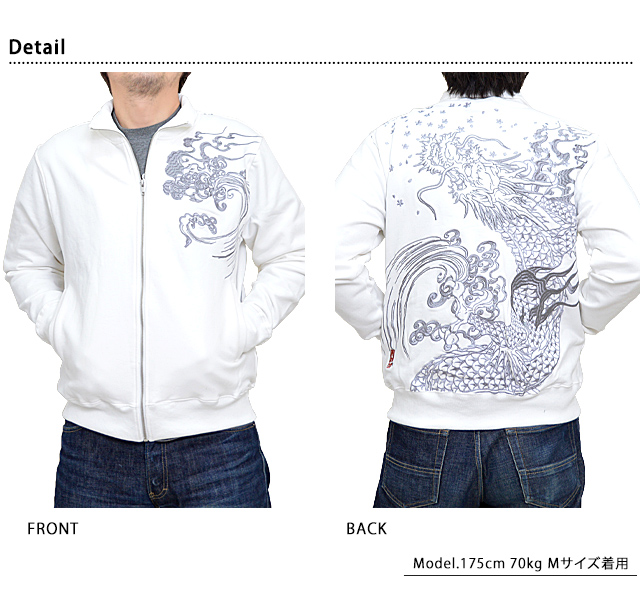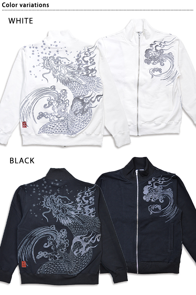 絡繰魂さんから「龍昇天ジップアップ(224068)」のご紹介です。 少し肌寒い季節には羽織物として、真冬にはトレーナー代わりのインナーとして重宝するジップアップジャージが登場しました。 ボディーには肉厚なベロア生地を採用。 背中には巨大な龍を刺繍でデザイン。 バックにしっかり柄を入れている分、フロントはシンプルにデザインし、メリハリをつけました。 | |||||||||||||||||||||||||