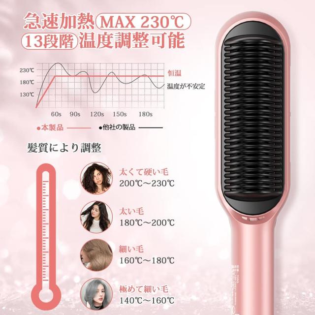 【14段階温度調整可能&360度回転コード】髪質に合わせて100℃〜230℃まで14段階温度を調整可能です。自分のニーズに応じて軟毛・細毛・ダメージ毛・硬毛・太毛まで幅広く対応できます。温度記憶機能も備え、前回設定した温度を自動的に記憶し、繰り返し温度設定の手間を省きます。それに、ヘアアイロンブラシをご使用時にコードが絡まないように360℃回転コードを設計されました。お好きな角度に調整できます。