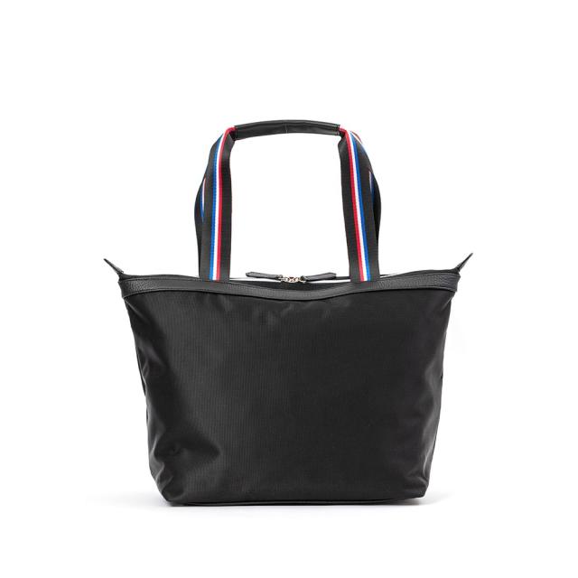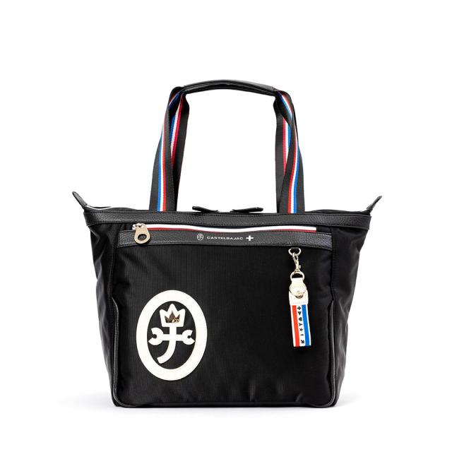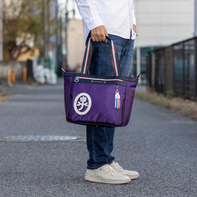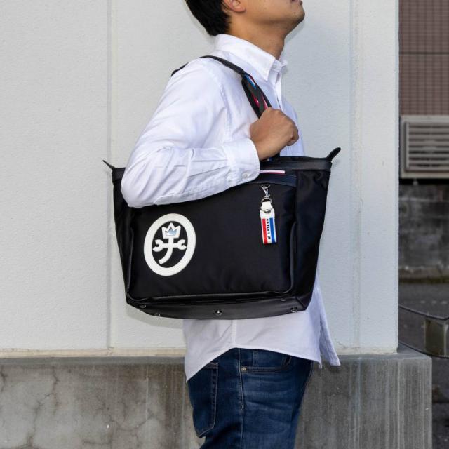 A4ファイルをラクラク収納できる大容量のトートバッグ。正面にファスナーポケット、メインルームにオープンポケット×2・ファスナーポケット・ホック付きポケット・ボトルホルダーを装備しており、小物の収納に最適です。