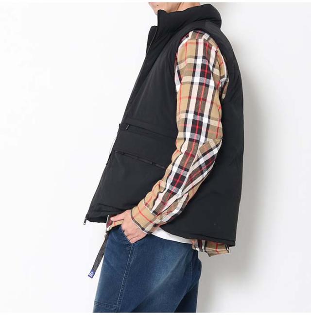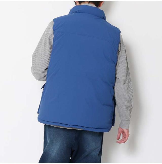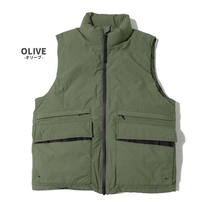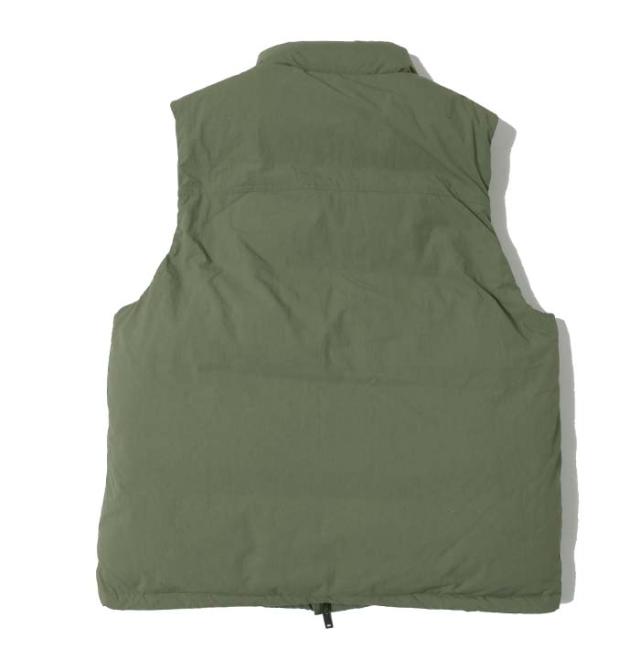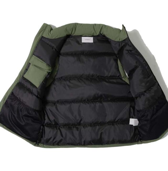 適度なハリのあるナイロン生地を使用したダウンベスト。