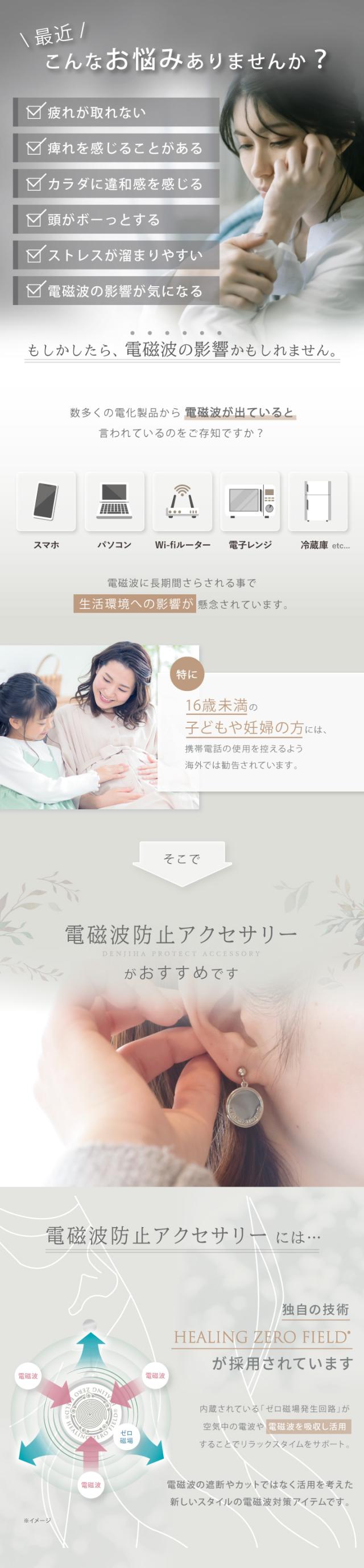 | 商品特性 | 従来の電磁波の遮断やカットとは真逆の発想から開発した独自の技術「HEALING ZERO FIELD」を採用。周囲の電波や電磁波などを吸収・活用し、リラックスをサポートすることで電磁波の影響(ストレスダメージ)を緩和(防止)します。※上記の特性から5G環境下でも影響なくお使いいただくことができます |