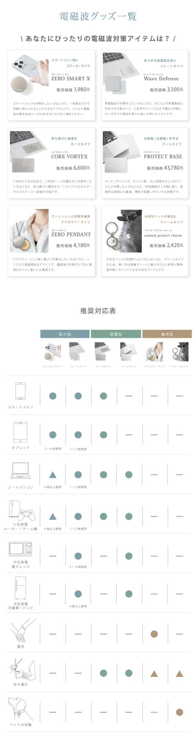 | 商品特性 | 従来の電磁波の遮断やカットとは真逆の発想から開発した独自の技術「HEALING ZERO FIELD」を採用。周囲の電波や電磁波などを吸収・活用し、リラックスをサポートすることで電磁波の影響(ストレスダメージ)を緩和(防止)します。※上記の特性から5G環境下でも影響なくお使いいただくことができます |