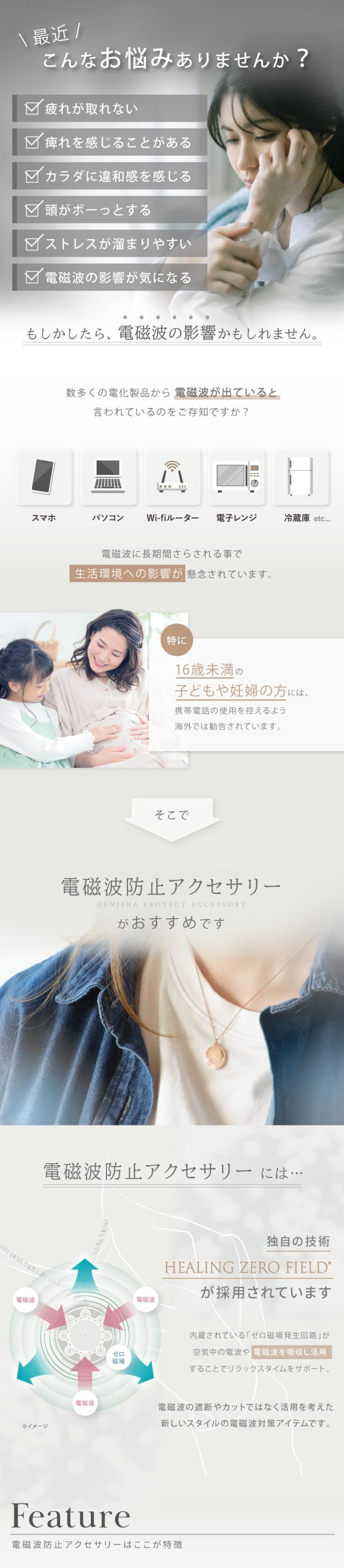 | 商品特性 | 従来の電磁波の遮断やカットとは真逆の発想から開発した独自の技術「HEALING ZERO FIELD」を採用。周囲の電波や電磁波などを吸収・活用し、リラックスをサポートすることで電磁波の影響(ストレスダメージ)を緩和(防止)します。※上記の特性から5G環境下でも影響なくお使いいただくことができます |