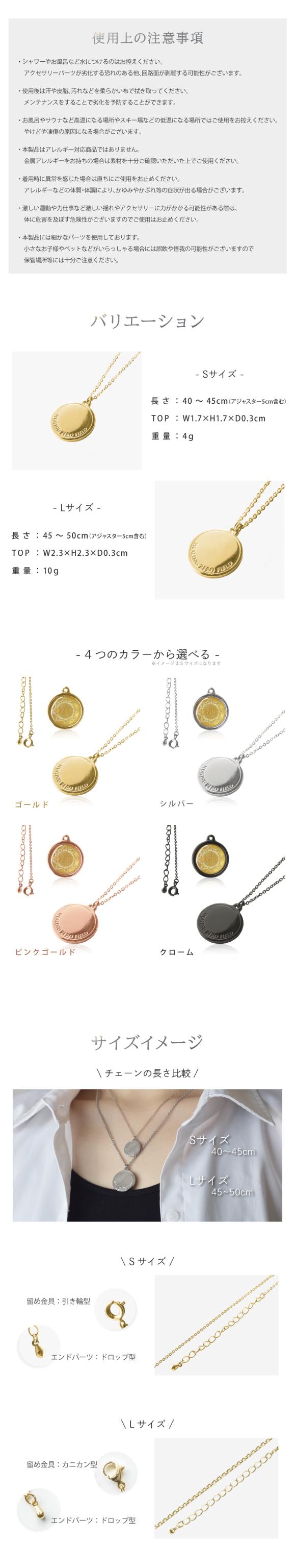 | 本体サイズ[重量] | Sサイズ:W17mm×H20mm×D3mm(チェーン:40ー45cm)[4g] Lサイズ:W23mm×H27mm×D3mm(チェーン:45ー50cm)[10g] |