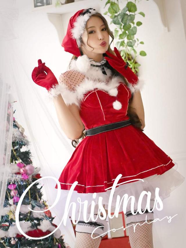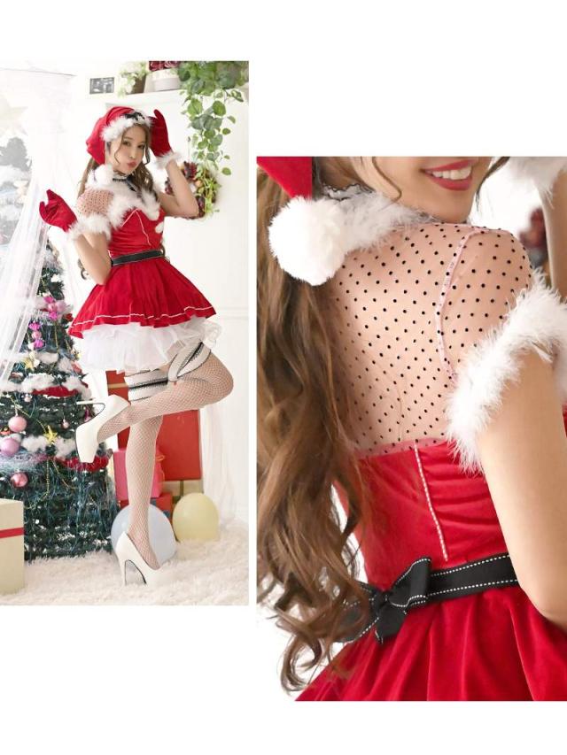☆定番のレッドサンタコスプレにドット柄チュールをあしらうことで女性らしい可愛らしさとシースルーの透け感でセクシーさもプラスしてくれるサンタコスチュームです。