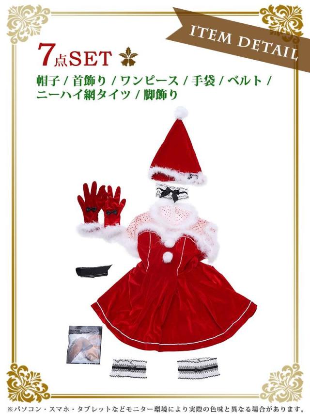 ☆赤に白のファーが映えるサンタ衣装は可愛いリボンとファーのついた小顔効果も狙えちゃうサンタ帽子もセットになっています!その他コスプレ小物を含む7点が入ったサンタコスプレセットなので急なクリスマスイベントやパーティーにも慌てず準備をしていただけるクリスマスコスプレSETです♪
