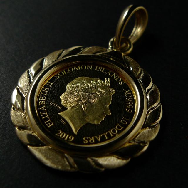 南太平洋の英連邦独立国・ソロモン諸島発行の1/25オンス純金コインに、K18製の枠が付いたペンダントトップです。