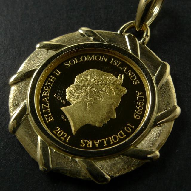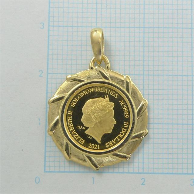 南太平洋の英連邦独立国・ソロモン諸島発行の1/25オンス純金コインに、K18製の枠が付いたペンダントトップです。