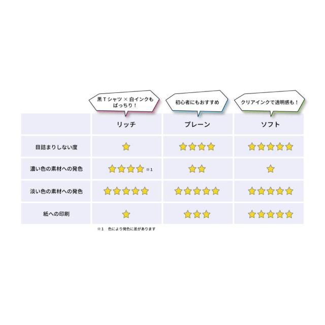 ・白などの淡色生地はもちろん、黒地や濃色生地にも発色のよいインクです。