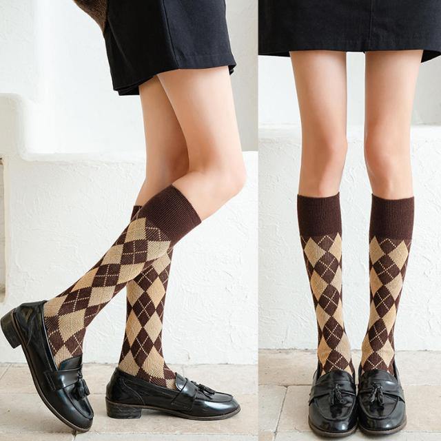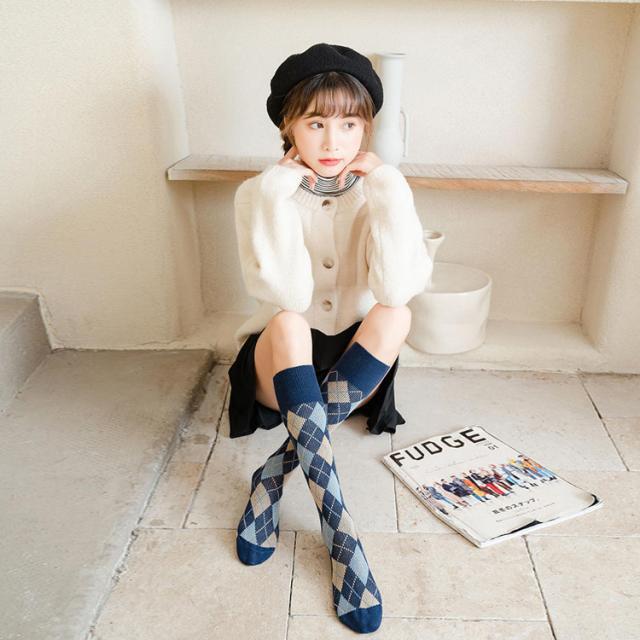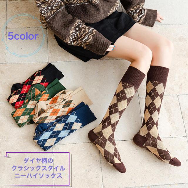 レディース クラシック ニーハイソックス 女子高生 コスチューム ガールズ 菱形 ダイヤ柄 女子高生風 通学 靴下 美脚 肌触り フィット感 伸縮性 ポイント消化