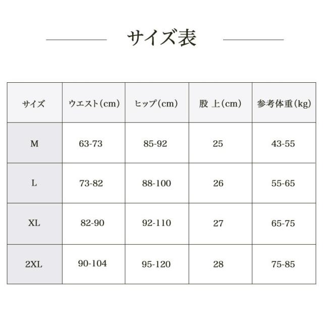 ●商品情報 サイズ:M、L、XL、2XL 【M】 ウエスト:63−73cm ヒップ:85−92cm 股上:25cm 【L】 ウエスト:73−82cm ヒップ:88−100cm 股上:26cm 【XL】 ウエスト:82−90cm ヒップ:92−110cm 股上:27cm 【2XL】 ウエスト:90−104cm ヒップ:95−120cm 股上:28cm