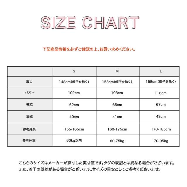 ●商品情報 【Sサイズ】 着丈:148cm(帽子を除く) バスト:102cm 袖丈:62cm 肩幅:40cm 参考身長:155-165cm 参考体重:60kg以内 【Mサイズ】 着丈:153cm(帽子を除く) バスト:108cm 袖丈:65cm 肩幅:41cm 参考身長:160-175cm 参考体重:60-75kg 【Lサイズ】 着丈:158cm(帽子を除く) バスト:116cm 袖丈:67cm 肩幅:43cm 参考身長:170-185cm 参考体重:70-95kg