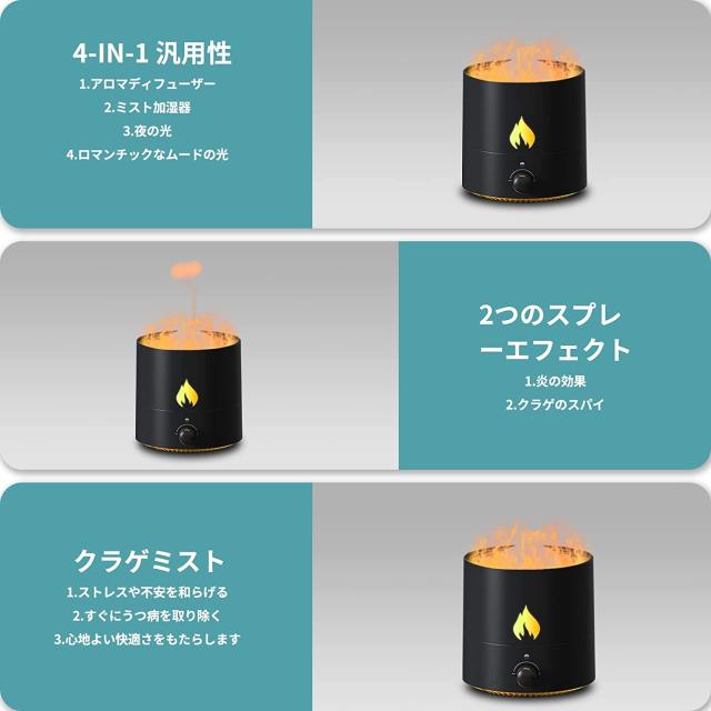 よりよく寝て、よりよく呼吸して、より良い生活を楽しめます! 【4-in-1多機能&ポータブル】この火炎ディフューザーはアロマディフューザー、加湿器、ロマンチック雰囲気ライト、ナイトライトとして使用も可能です。