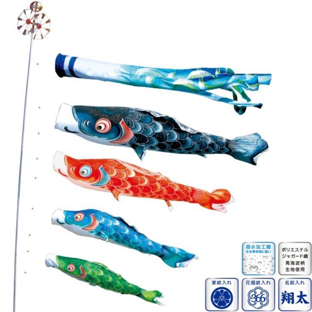 黒鯉 7m、赤鯉 6m、青鯉 5m、緑鯉 4m、風舞い吹流し 7m