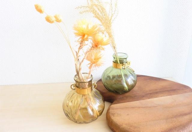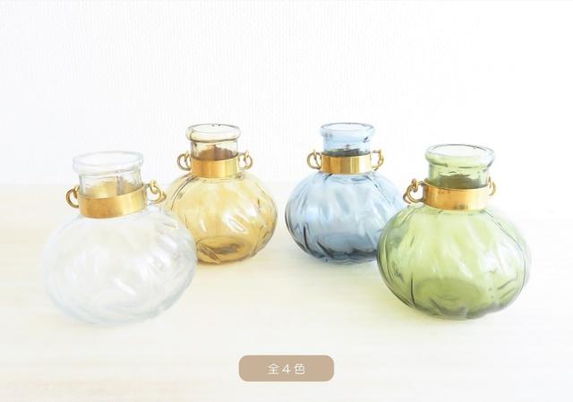 陽の光にあてると、ガラスと真鍮がキラリと光りとても印象的。季節の草花を生けたり、オブジェとしてもお楽しみ頂けます。リビングや玄関、棚の上などに置いて、花々のあるイロドリある暮らしを。カラー違い、タイプ違いで並べて飾るのもアリ。