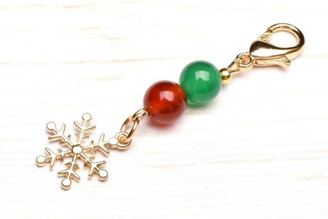 | 特徴・意味 | 12月にピッタリな可愛いクリスマスパーツを使用したチャームです。 カニカン付きでマスクチャームにもオススメです。 クリスマスカラーをイメージしてカーネリアンとグリーンカルセドニーを使用しています。 どちらも瑪瑙(アゲート)の仲間です。 石英の非常に細かい結晶が網目状に集まり、緻密に固まった鉱物です。 愛情をはぐくみ、優しい気持ちで人と接することができるようになるといわれ、多くの人に愛されています。 恐れや憂鬱を取り去ってくれ、思いやりの心を豊かにさせてくれると信じられており、それによって人間関係を円満にさせてくれるとされています。 ※ピアスの全長は約4cmです。 材質 ▼ スノー 雪の結晶 パーツ(ゴールド):10x14mm カーネリアン:6mm グリーンカルセドニー:6mm つぶし玉 (金):2.4mm カニカン |