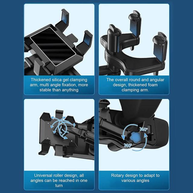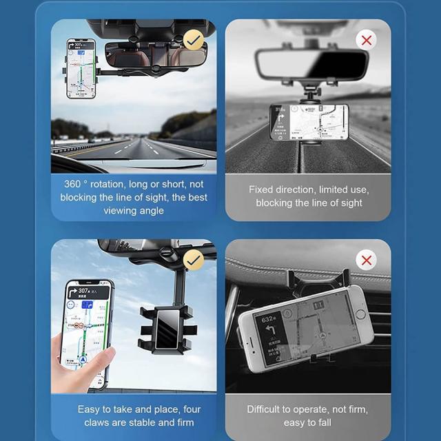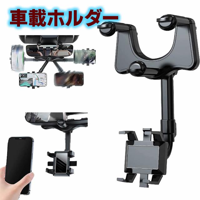 車載用ホルダー スマホホルダー 携帯ホルダー ルームミラー取り付け型 360度の自由回転 伸縮可能 片手操作 滑り防止 高安定性 取り付け簡単 バッグミラー iPhone xperia Galaxy Docomo au SoftBank 多機種対応 送料無料