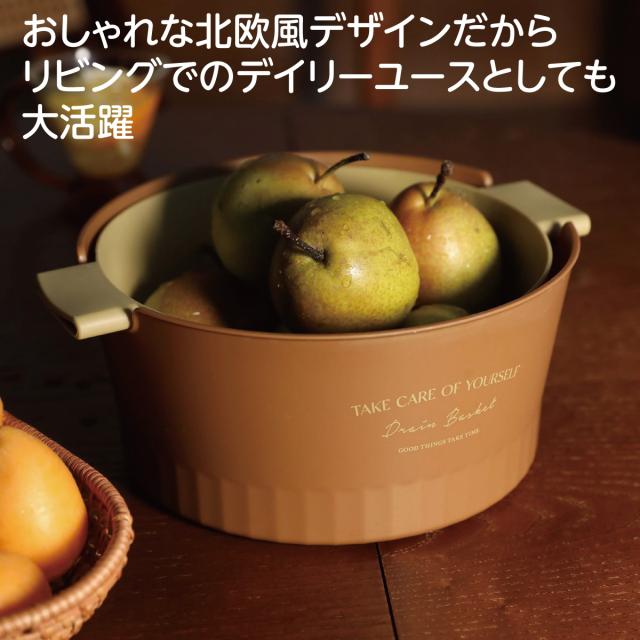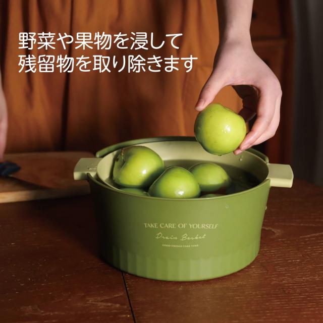 丸みのある外観、握りやすいグリップ、水切りバスケットとボウルのサンドイッチ構造になっています。