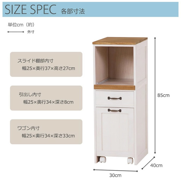 キャスター付きで移動がラクラク! 炊飯器&1.5リットルペットボトルも収納できる カントリー調ミニキッチンワゴン! ■サイズ (約)幅30×奥行40×高さ85cm ■素材 主材:桐材 ■内寸及び補足説明 引出内寸:(約)幅25×奥行34×深さ8cm ワゴン内寸:(約)幅25×奥行34×深さ33cm オープン部内寸:(約)幅25×奥行37×高さ27cm スライド棚付 1口コンセント付 ※写真はメーカー様のカタログ等から掲載させて頂いております。 実物の商品と写真の色が若干写真写り等により異なる場合がありますのでご注意くださいませ。 万が一の際でございましても返品はお受け致しかねます。 ※写真に写っている小物などは付属しておりません。 ※お客様組立て品につきましては、組み立て後に不良の連絡をされても対応ができません。 組み立て前にパーツに不良・傷等がないか、必ずご確認下さいます様よろしくお願い申し上げます。 ※記載は商品仕様の一部です。仕様説明不足等の理由での返品はできません。特に適合等は必ずご確認ください。