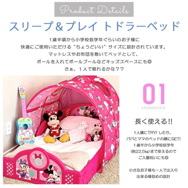 『ディズニー ミニーちゃんのプレイヤード兼 幼児用ベッド』 天蓋に沢山描かれたミニーちゃんがとっても可愛い自慢のベッド! ボールを入れてボールプールなど、プレイスペースとしてもお使い頂けます。 サイドフレームに高さがあり、転倒防止 標準的な幼児用マットレスが使用可能(マットレスサイズ約134cm×70cm×17cm) ※マットレスやシーツなどは別途ご用意ください |