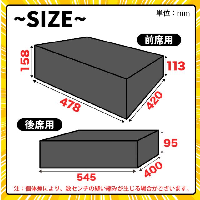 | 注意事項 | 前席用:幅47.8cm×奥行42cm×高さ(高)15.8cm/(低)11.3cm 後席用:幅54.5cm×奥行40cm×高さ9.5cm ※本サイズは目安です。縫製誤差等で寸法が若干変動する場合もございます。 ・車内を清掃してからご使用ください。 マットが汚れた場合は、生地を洗濯をしてください。 ・本製品は、強い力で一点に負荷をかけると 表生地や縫製部分が破損する恐れがございます。 ・本製品の上で鋭利な荷物などを無理に引きずると、 生地が損傷するのでおやめください。 ・レザーシート等、本製品のジッパーのスライダーで傷つける 可能性がありますので事前に傷防止の養生をしてください。 ・本製品には裏と表がございます。角度が垂直側が表面となり 裏面に生地のジッパーがくるようにお取り付けください。 ・商品に付いています「洗濯表示」をご確認の上、お手入れをお願いします。 【ウレタンには必ず臭いがございます】 本製品はウレタンフォームを使用しております。新品のウレタンフォームには必ず臭いがございます。匂いは新車のお車と同じで数ヶ月から数年で完全になくなります。 臭いによる返品交換はできませんので予めご了承ください。 【販売条件の違い】本製品は素材機能をメーカーのギャランディどうりご提供させていただくため、製造ロットを表題の末尾で管理しております。 各、商品ページにある表題末尾の数字が小さいほど生産された後、年数が経過している商品となります。 また、末尾の数字が大きいほど新しく生産された製品です。耐久性の目安としてお選びください。 |