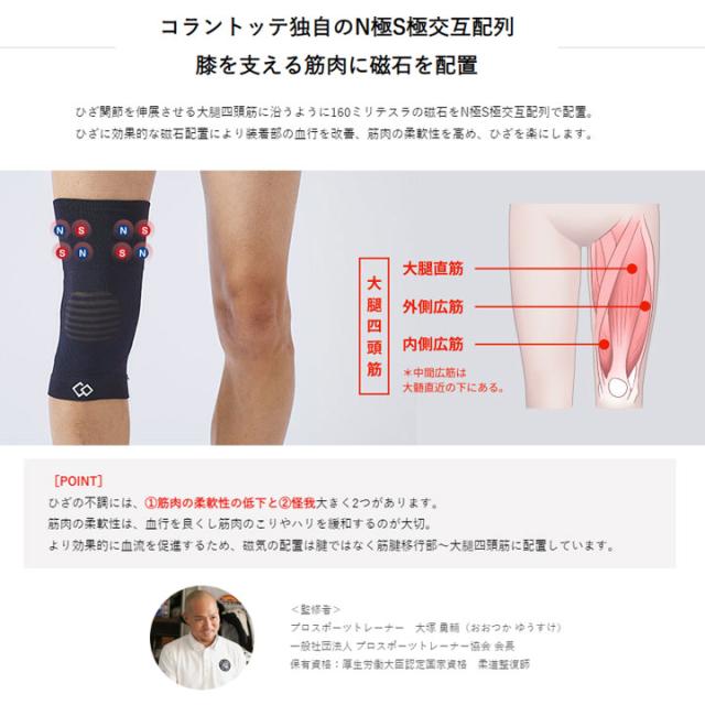 ひざ上の大腿四頭筋に沿うようにフェライト永久磁石160ミリテスラ×8個をコラントッテ独自の