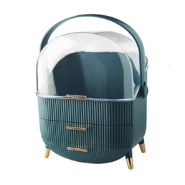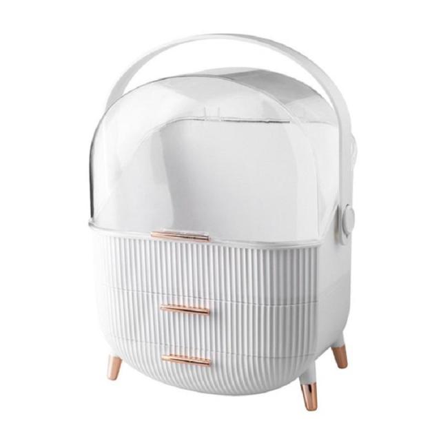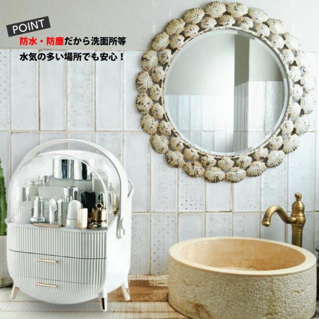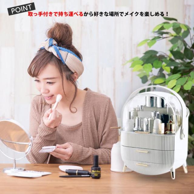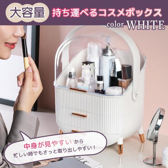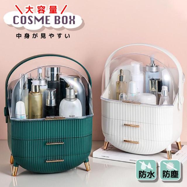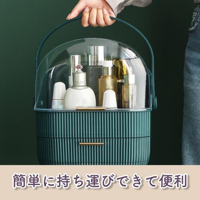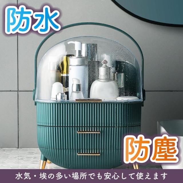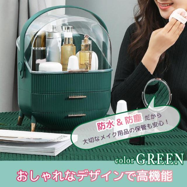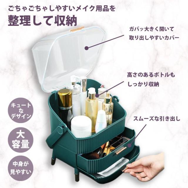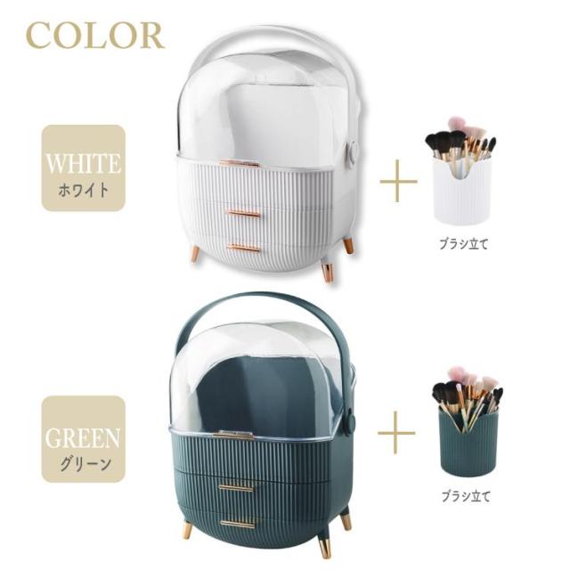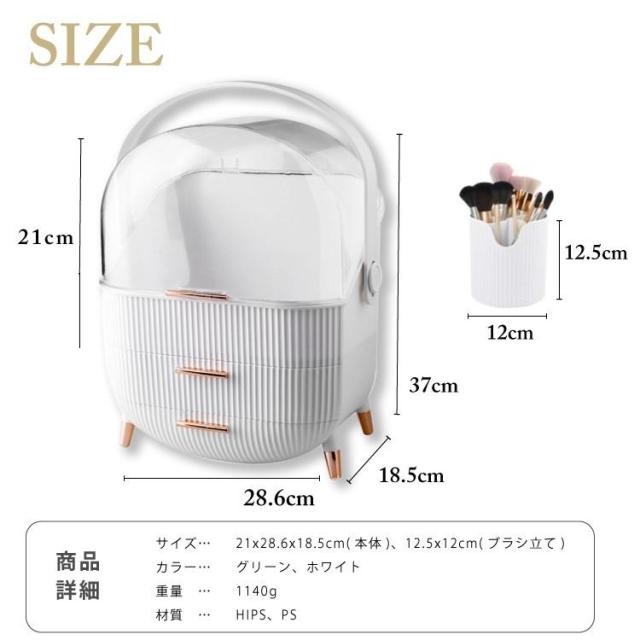 ボックス上部は高さ21cmのボトルを立てたまま収納可能です。カバーが90度開くので出し入れ収納簡単です。ブラシ立ても付属しているので、便利です。引き出しが2つあり、小物をすっきり収納できごちゃごちゃになってしまう、コスメをしっかり収納できます。上部のクリアカバーと引き出し付きのおしゃれなデザインです。取っ手付きデザインなので持ち運びに便利なので、洗面所やリビング等お好きな場所でメイクを楽しめます。【カラー】・ホワイト・グリーン【サイズ】商品外寸縦約37cm×約28.6cm×18.5cm引き出し内寸下段 奥行約17cm 横幅約23.5cm 深さ 最大5.5cm上段 奥行約16.5cm 横幅約24.5cm 深さ 約4.5cm上部収納高さ最大 約21cm 横幅約24.5cm 奥行約17cmブラシ小物立てサイズ縦約12.5cm 直径約12cm※メジャー採寸の為、サイズが多少異なる場合がございます。予めご了承ください。