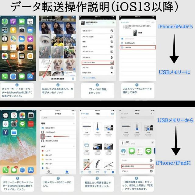 | 使用上のご注意 | ※USBメモリが64GB以上なら、パソコンで専用diskgeniusソフトをダウンロードして、USB格式をfat32かexfatに変換する必要があります。 また、USBメモリ内は「DCIM」⇒「101_FUJI」というフォルダを作成して頂く必要があります。 「101_FUJI」フォルダに写真やビデオを入れたらiPhoneに認識できます。 |