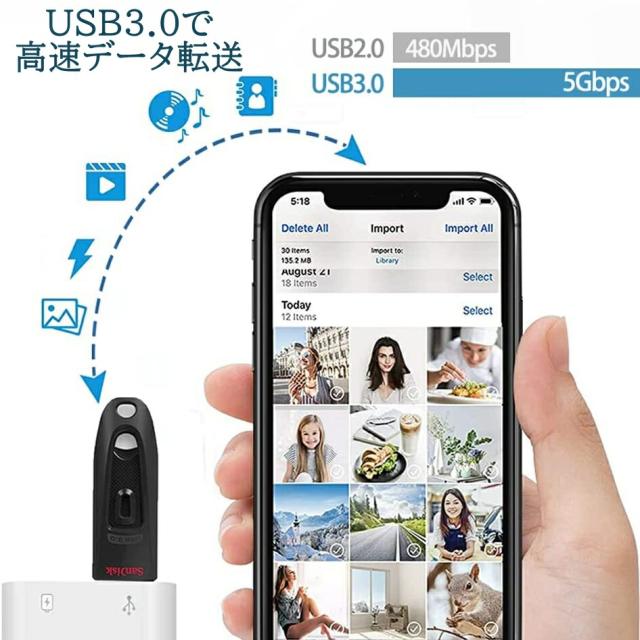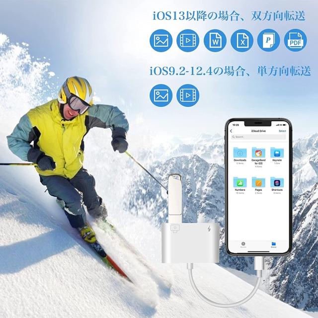 データは数秒内で転送完了。iOSデバイスとカメラを接続するとデジカメから写真とビデオを転送できます。iOS13以降の場合は双方向転送ができ、写真や動画はもちろん、音楽・ExcelやPDFなどの書類データも転送可能。