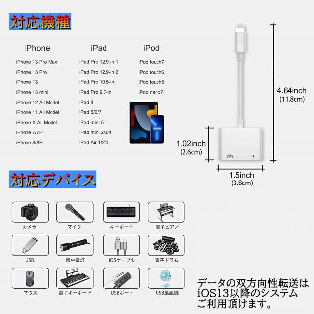 ●多デバイス対応 と併用でキーボードとマウスを同時に接続可能になります。 iOS 9.2以降対応。対応:MIDIキーボード、電子ピアノ、SD/microSD用のカードリーダー、ドラム、オーディオインターフェース、調音器、USBメモリ、USBキー、モバイルハードディスク、マウス、Wifi、ゲームコントローラ、スキャンガン、プリンター、プロジェクター、レーザーチェックペン、マイクなどの設備を対応できます。 ●簡単操作 アプリ&ネットワークが要らず、面倒なドライバも不要。アップルデバイスとカメラを接続するとデジカメから写真とビデオを転送できます。デバイス間で写真やビデオを共有できます。USBカメラアダプタはJPEG、RAWなどの標準的な画像形式をサポートし、H.264、MPEG-4などのSDとHDビデオ形式もサポートできます。 ●高速転送 データは数秒内で転送完了。iOSデバイスとカメラを接続するとデジカメから写真とビデオを転送できます。iOS13以降の場合は双方向転送ができ、写真や動画はもちろん、音楽・ExcelやPDFなどの書類データも転送可能。 ●コンパクト 約20gと軽量。コンパクトサイズで持ち運び便利です。 |