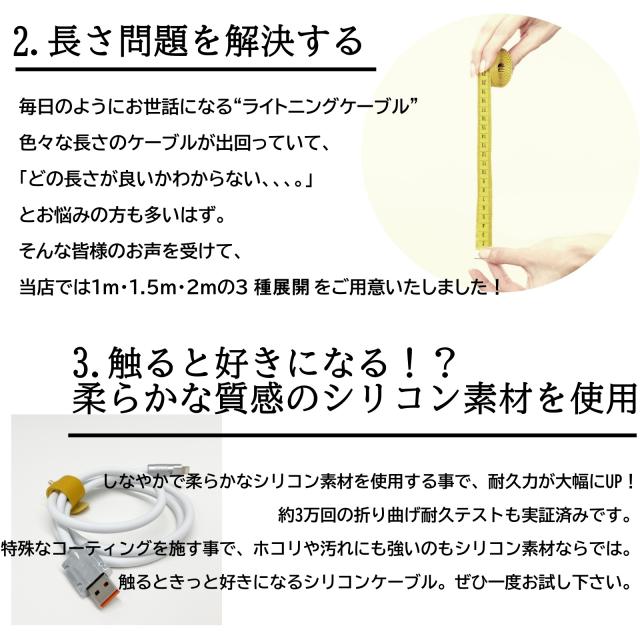 【やわらかく、絡まない】束ねてバッグやポケットに入れたり、モバイルバッテリー等の携帯用充電器に巻き付けて持ち運んだりしても絡みにくく、出し入れもスムーズです。巻いたりまとめたりしても癖がつきにくいため、いつでもスマートにご使用いただけます。赤ちゃんの肌のような感触の新しいシリコン素材に特殊なコーティングを施し、ホコリがつきにくくなっています。 【優れた耐久性】約30000回の折り曲げにも耐える優れた耐久性を実現しているため、ケーブル内部のワイヤーを断線から保護し、安心して充電することができます。 【好みに合わせたカラーバリエーション】(全5色)スマートフォン本体やケースの色に合わせたり、自分好みの色を選びやすいカラー展開。 バッグや小物と合わせてコーディネートすることも出来ます。 【対応機種】iphone(アイフォン)、iPadなどのあらゆるデバイスへ対応しております。 【24ヶ月保証】商品着荷後、レビューをご投稿すると、保証が24ヶ月になります。商品到着後、何かご疑問及びご意見等がございましたら、店舗までご連絡下さいませ。 ●メール:info@qisi.store ●電話:072-943-3961 ■対応機種 iPhone各種 (iPhone14ProMax iPhone14Pro iPhone14 iPhone14Plus, iPhoneSE3 iPhone13ProMax iPhone13Pro iPhone13 iPhone13mini, iPhone12ProMax iPhone12Pro iPhone12 iPhone12mini ,iPhoneSE2,iPhone11Pro Max,iPhone11pro,iPhone11,iPhoneXS MAX,iPhoneXS, iPhoneX,iPhone8,iPhone8Plus,iPhone7,iPhone7Plus, iPhone6,iPhone6s,iPhone6Plus,iPhone6sPlus, iPhoneSE,iPhone5s,iPhone5,iPhone5c..etc) iPad各種 iPad Air,iPad Air2, iPad Pro(12.9インチ),iPad Pro(9.7インチ), iPad(第4世代),iPad(第5世代) |