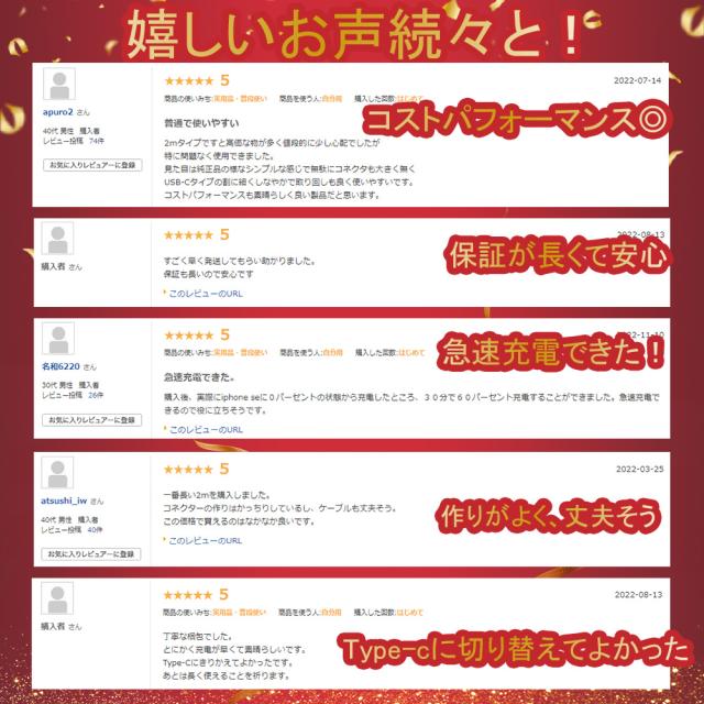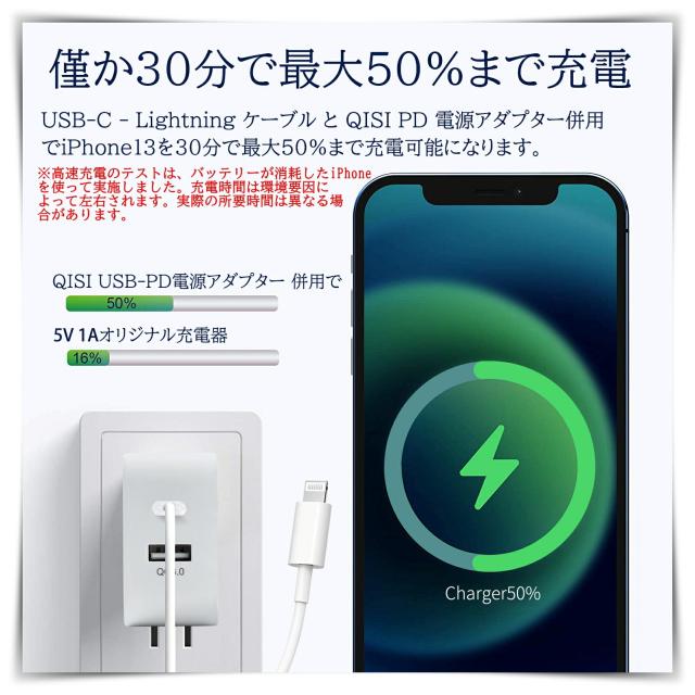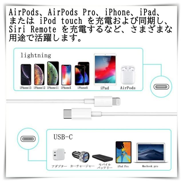 と併用で約 30 分で iPhone 12を最大 50 % まで高速充電できます。 ■20Wの超急速充電可能!Type-C to Lightningケーブル ■AirPods、AirPods Pro、iPhone、iPad、または iPod touch を充電および同期し、Siri Remote を充電するなど、さまざまな用途で活躍します。 ■AirPods、AirPods Pro、iPhone、iPad、または iPod touch を USB-C ポートに接続して充電する。 ■一部のモデルの iPhone を Apple USB-C - Lightning ケーブルで USB-C 電源アダプタに接続した場合に、高速で充電する。 ■iPhone、iPad、または iPod touch を Mac または Windows パソコンの USB-C ポートに接続して、デバイスを同期したり写真を読み込んだりする。 ■Siri Remote を Mac、Windows パソコン、または USB-C 電源アダプタの USB-C ポートに接続して充電する。 ■Magic Mouse、Magic Keyboard、Magic Trackpad などの Apple 製アクセサリを充電する。 ■iPhone または iPad を USB-C - Lightning ケーブルで接続して、それらのデバイスのインターネット共有機能を使う。 ■充電規格USB PD(USB Power Delivery)対応! ■対応機種 iPhone各種 (iPhone14ProMax iPhone14Pro iPhone14 iPhone14Plus, iPhoneSE3 iPhone13ProMax iPhone13Pro iPhone13 iPhone13mini, iPhone12ProMax iPhone12Pro iPhone12 iPhone12mini ,iPhoneSE2,iPhone11Pro Max,iPhone11pro,iPhone11,iPhoneXS MAX,iPhoneXS, iPhoneX,iPhone8,iPhone8Plus,iPhone7,iPhone7Plus, iPhone6,iPhone6s,iPhone6Plus,iPhone6sPlus, iPhoneSE,iPhone5s,iPhone5,iPhone5c..etc) iPad各種 iPad Air,iPad Air2, iPad Pro(12.9インチ),iPad Pro(9.7インチ), iPad(第4世代),iPad(第5世代) ■データー転送可能 充電だけではなくデーター転送にも対応しています。 製品仕様 コネクタ形状 USB Type-Cオス-Lightning ケーブル長(約): 100cm 150cm 200cm 重量(約):14g/1m,18g/1.5m 22g/2m 最大出力 :20W |