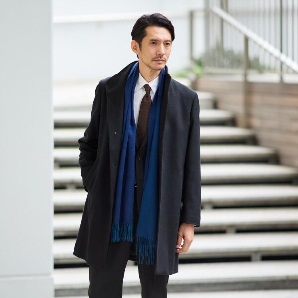 トップ釦を外してVゾーンを広めに作り、マフラーやネクタイで色を挿す事をお勧めします。