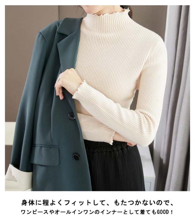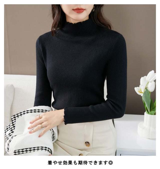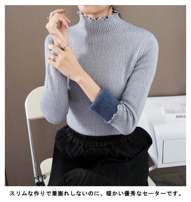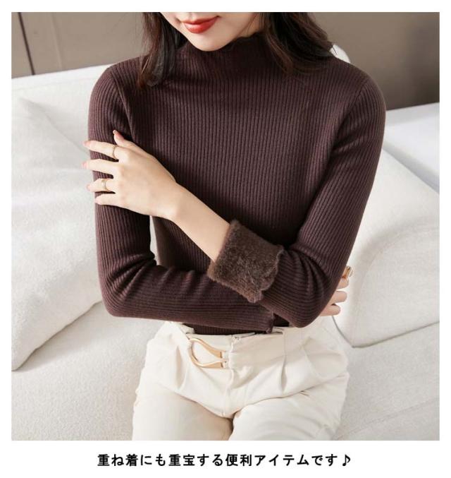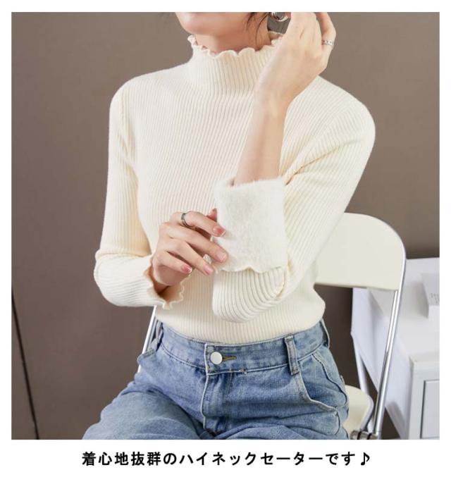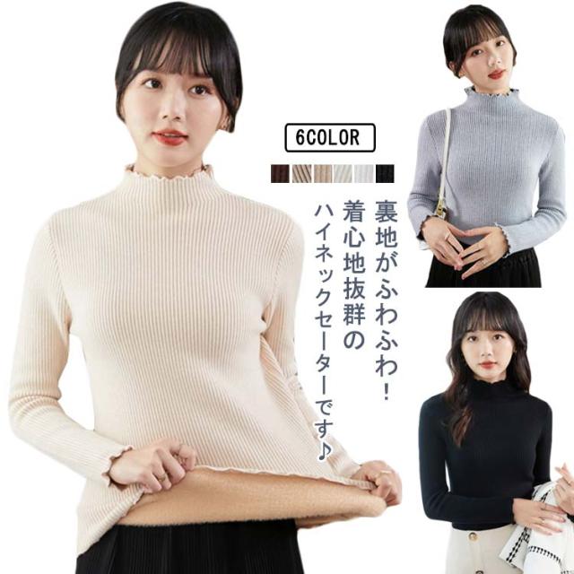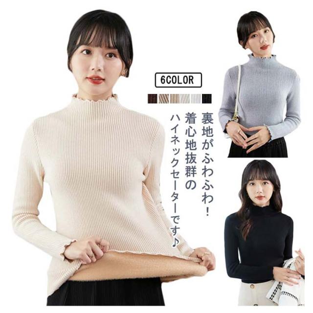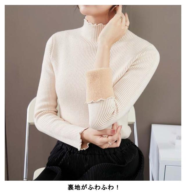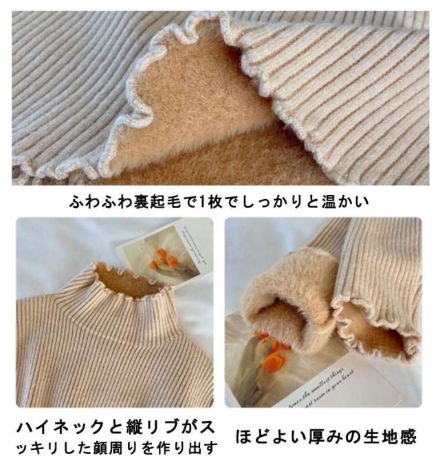 裏起毛ニット セーター レディース ハイネック 長袖 秋冬 フリル インナー リブニット トップス 大人可愛い 流行 カジュアル シンプル 無地 あったか もこもこ 厚手 フリース カットソー 通勤 オフィス