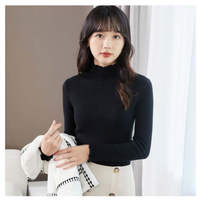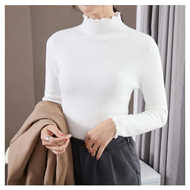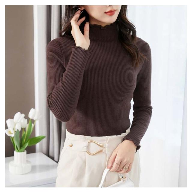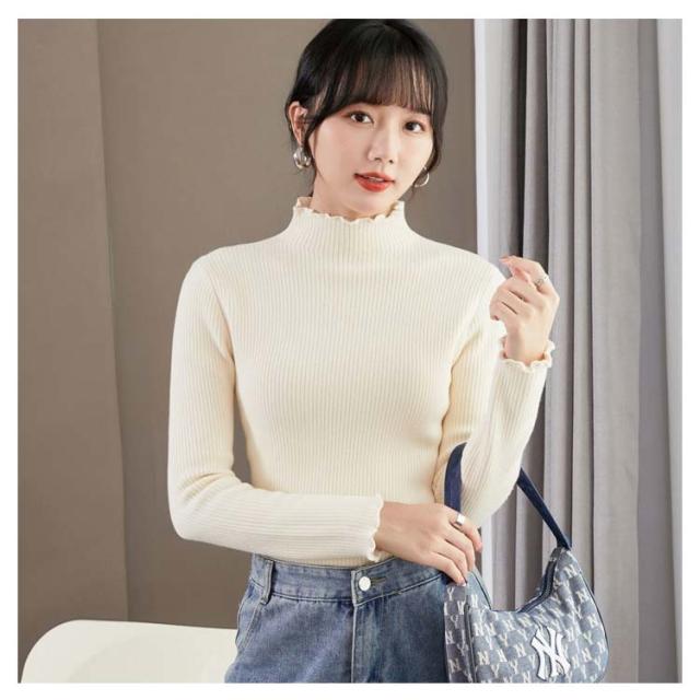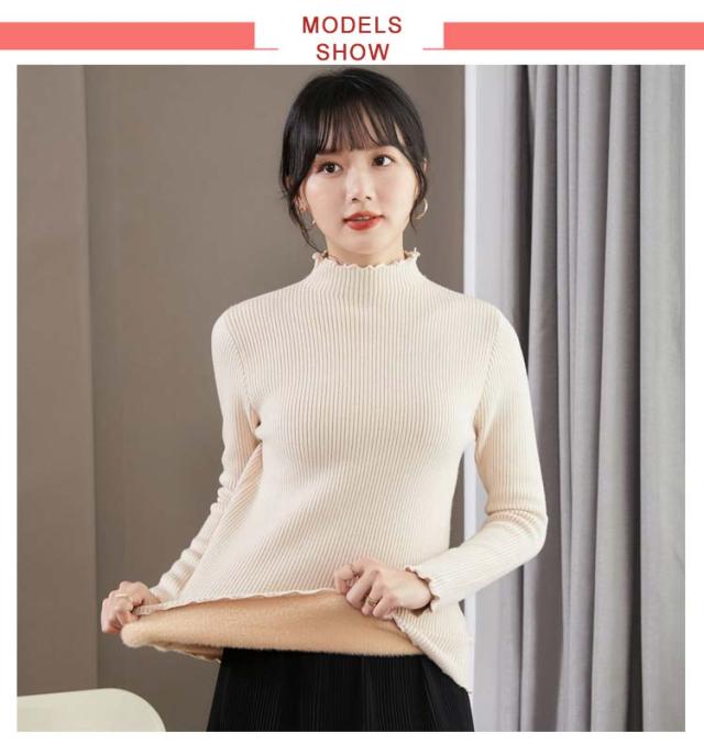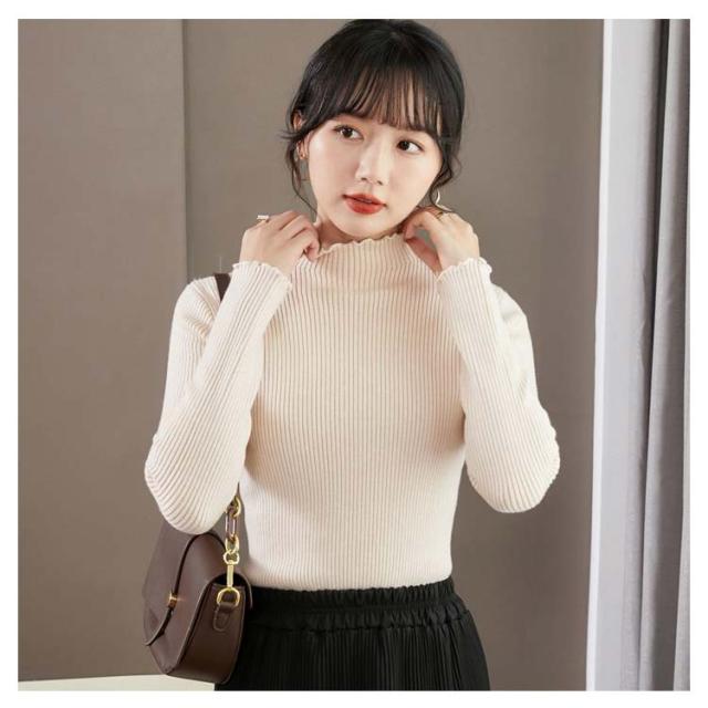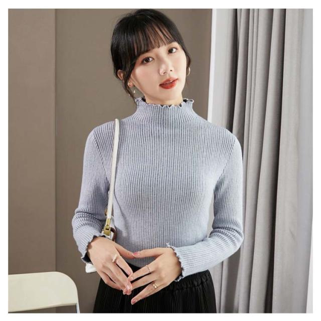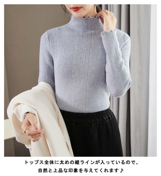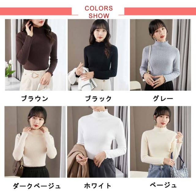 裏起毛ニット セーター レディース ハイネック 長袖 秋冬 フリル インナー リブニット トップス 大人可愛い 流行 カジュアル シンプル 無地 あったか もこもこ 厚手 フリース カットソー 通勤 オフィス