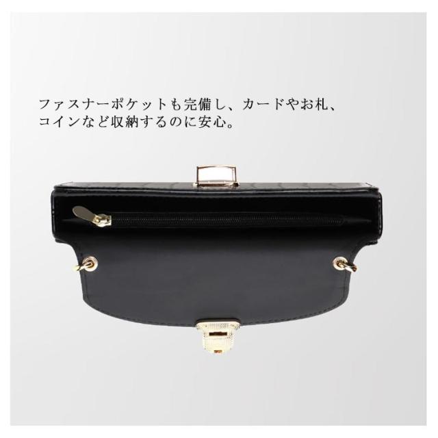 | 上品でおしゃれ、光沢のあるワニ型押しポシェット。 スマホやリップ、鍵などをすっぽり入れて、シンプルながらも機能的。 上質な光沢のあるワニ柄、高級感のある留め具、パーティーや結婚式など場面も活躍できます。 ファスナーポケットも完備し、カードやお札、コインなど収納するのに安心。 | |