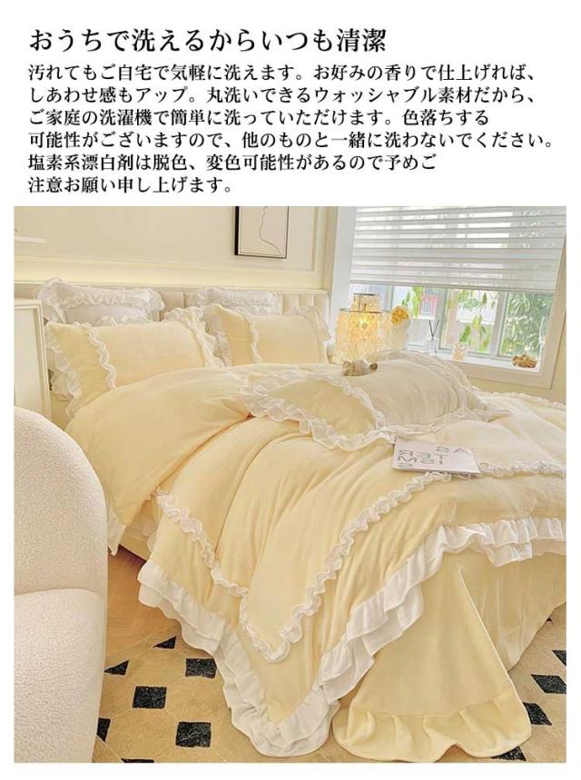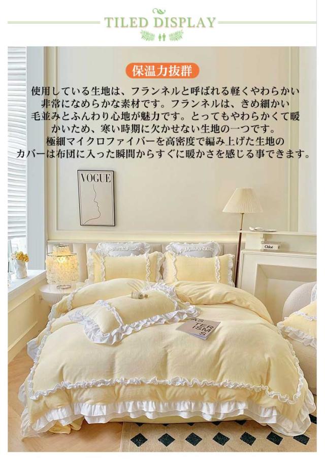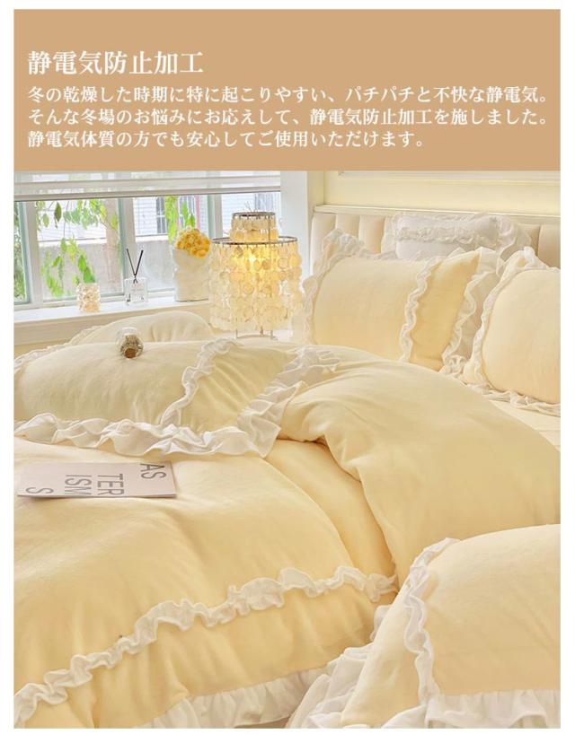 | 【保温力抜群】使用している生地は、フランネルと呼ばれる軽くやわらかい非常になめらかな素材です。フランネルは、きめ細かい毛並みとふんわり心地が魅力です。とってもやわらかくて暖かいため、寒い時期に欠かせない生地の一つです。極細マイクロファイバーを高密度で編み上げた生地のカバーは布団に入った瞬間からすぐに暖かさを感じる事できます。 【仕様UP】布団カバーは入り口部分は開閉しやすいファスナータイプ。お洗濯時のカバー交換も楽々とできます。また掛布団カバーにはファスナー部分が隠れるように仕立てています。ベッドカバーの角にひもが付いていてズレ防止になります。 【静電気防止加工】冬の乾燥した時期に特に起こりやすい、パチパチと不快な静電気。そんな冬場のお悩みにお応えして、静電気防止加工を施しました。 静電気体質の方でも安心してご使用いただけます。 【おうちで洗えるからいつも清潔】汚れてもご自宅で気軽に洗えます。お好みの香りで仕上げれば、しあわせ感もアップ。丸洗いできるウォッシャブル素材だから、ご家庭の洗濯機で簡単に洗っていただけます。色落ちする可能性がございますので、他のものと一緒に洗わないでください。塩素系漂白剤は脱色、変色可能性があるので予めご注意お願い申し上げます。 | |
