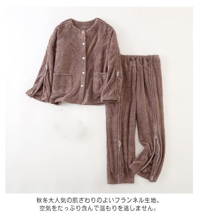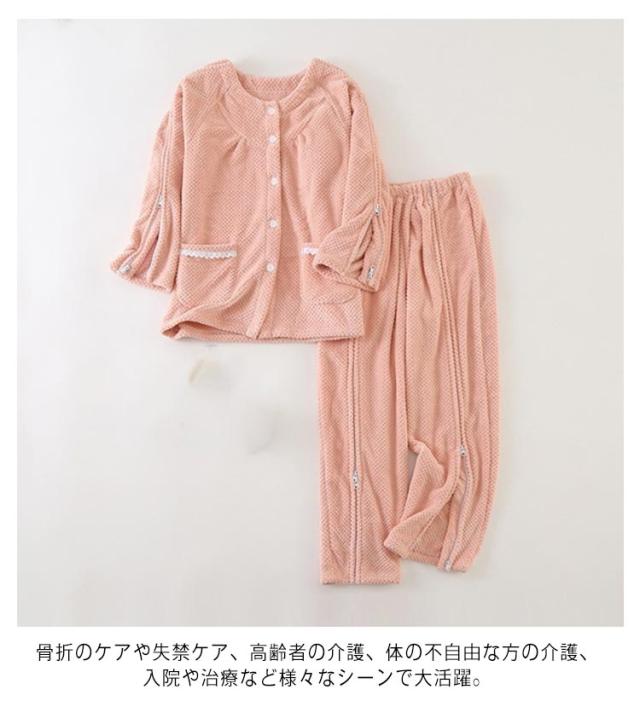 | 暖かい介護パジャマ上下セット。 秋冬大人気の肌ざわりのよいフランネル生地、空気をたっぷり含んで温もりを逃しません。 上着の前開き部分はマジック止めに飾りボタン、見た目は普通のパジャマのようにおしゃれ。両脇はファスナーで全開できるから、チューブ、点滴や検温など時必要な部分だけ、開けることできるから、面倒な着脱が不要!通院中や診察時も大変助かります。 骨折のケアや失禁ケア、高齢者の介護、体の不自由な方の介護、入院や治療など様々なシーンで大活躍。 | |