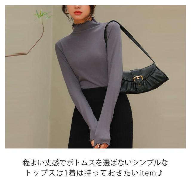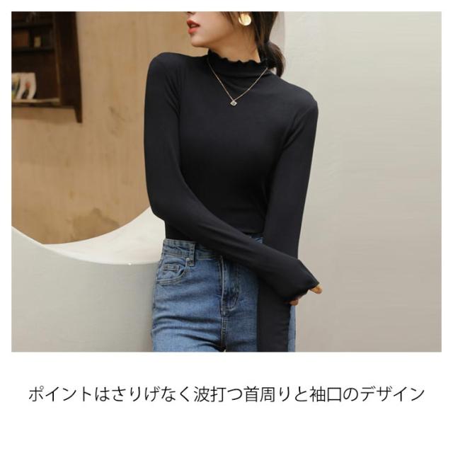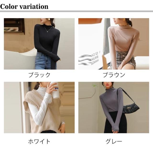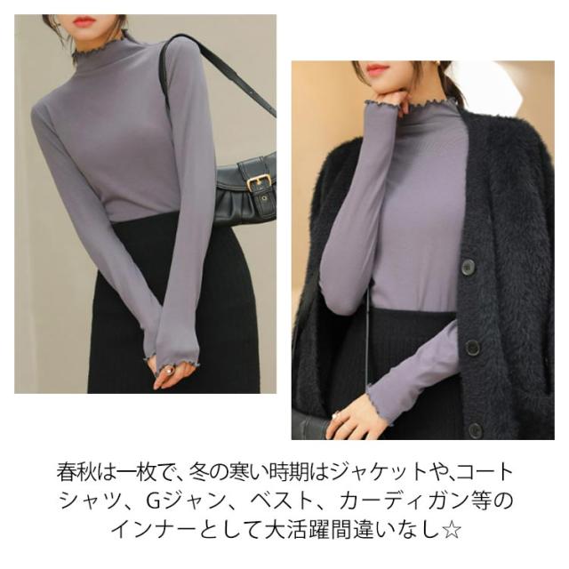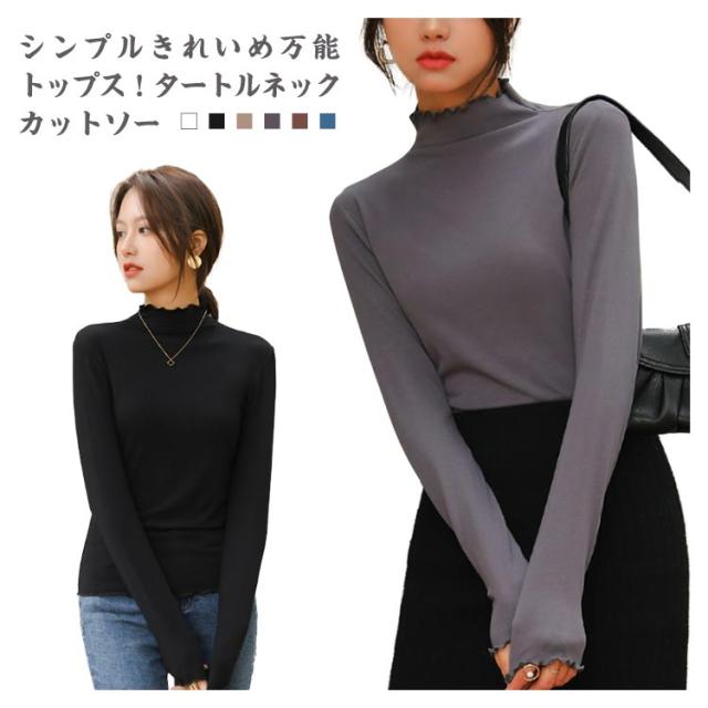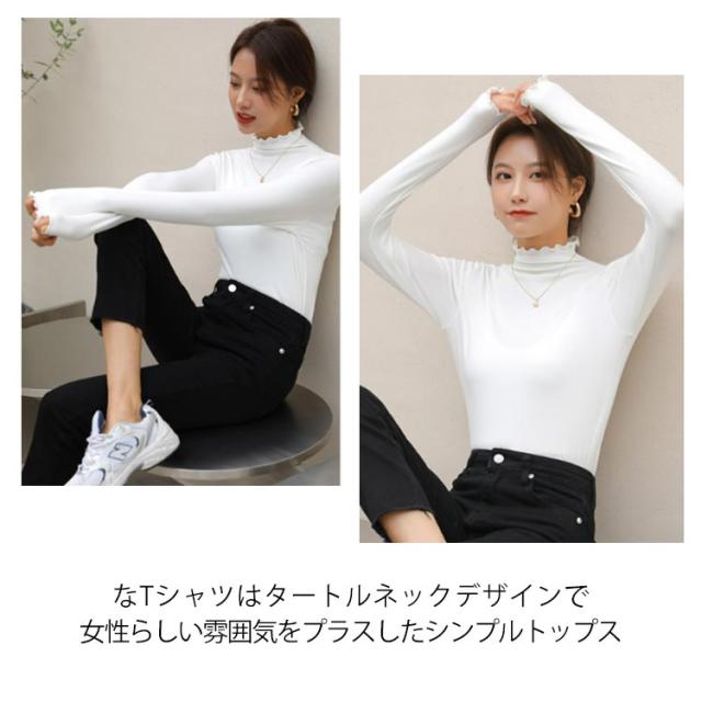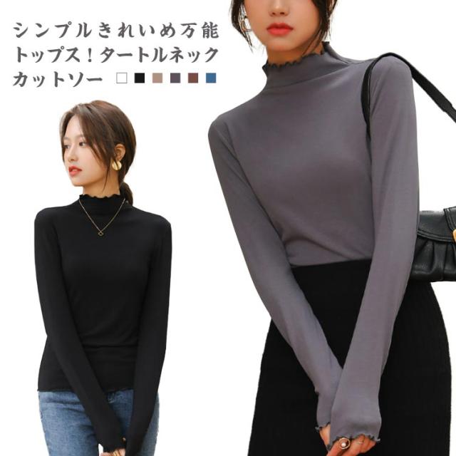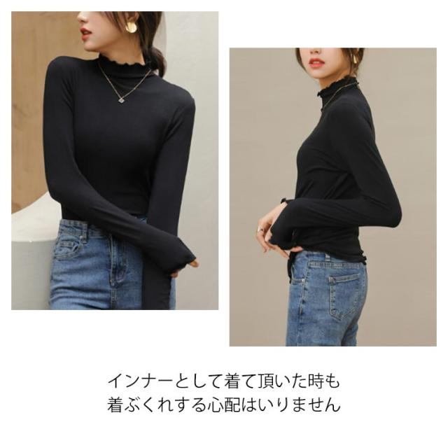 タートル カットソー Tシャツ レディース 長袖Tシャツ タートルネック ハイネック フリル メロウトップス ロンT インナー レイヤード 重ね着 タイト シンプル 伸縮性 大人 カジュアル トレンド 着回し 無地 細身 薄手 オールシーズン