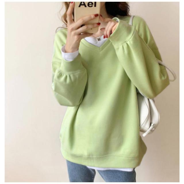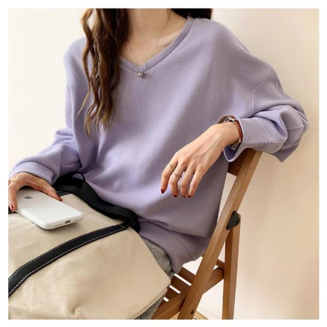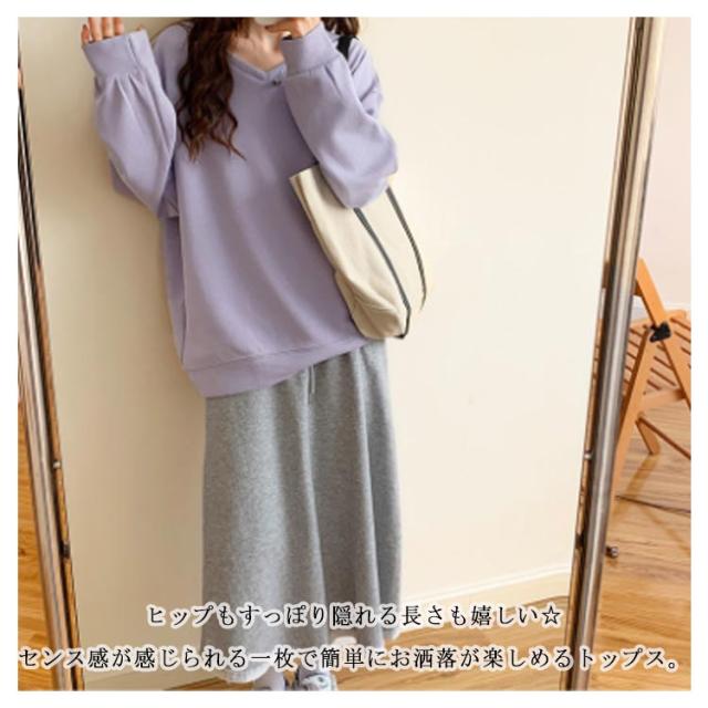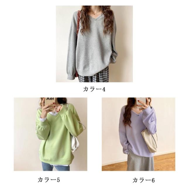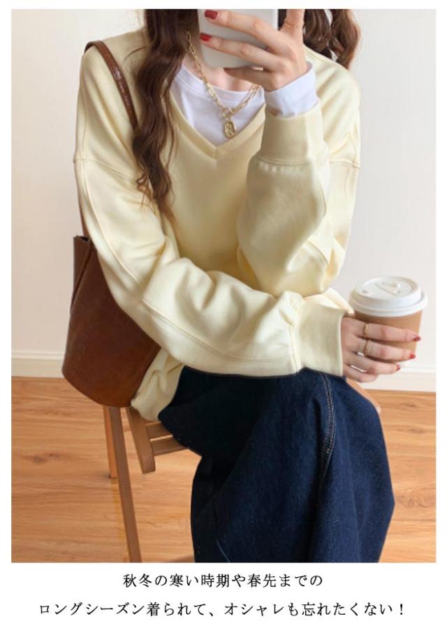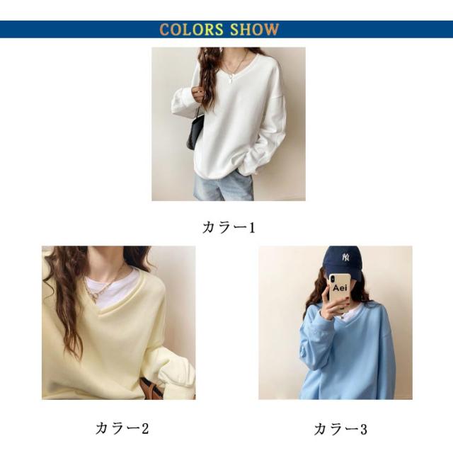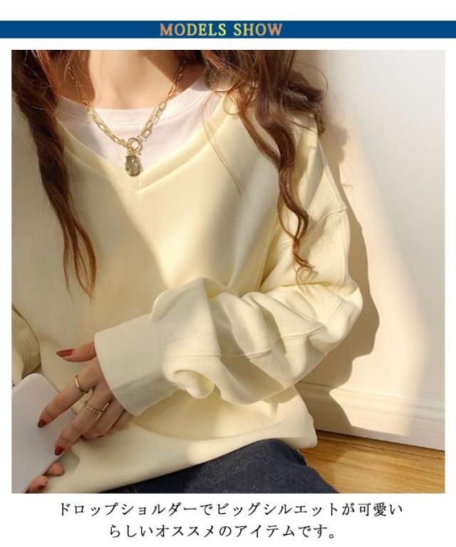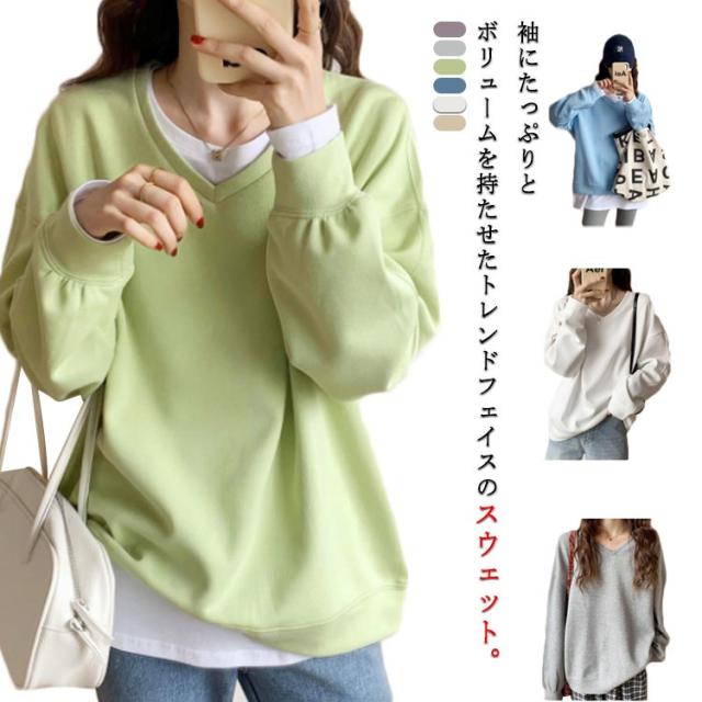 送料無料 トレーナー スウェット Tシャツ スエット Vネック レディース プルオーバー パーカー 長袖 トップス カットソー 無地 軽量 ボリューム袖 ドロップショルダー レイヤード 重ね着 ゆったり 大きいサイズ 体型カバー カラバリ