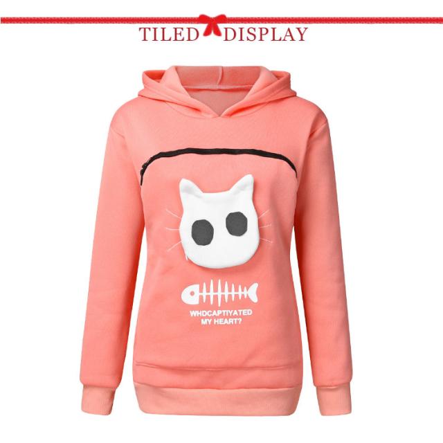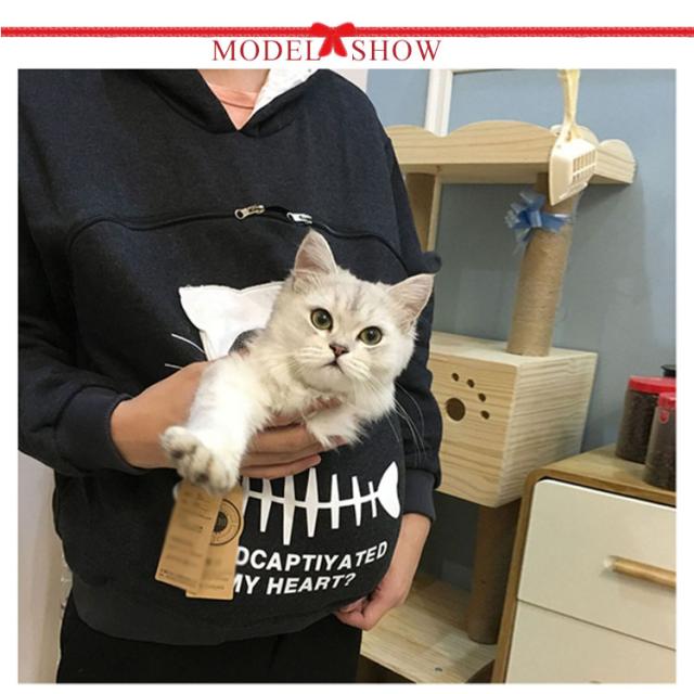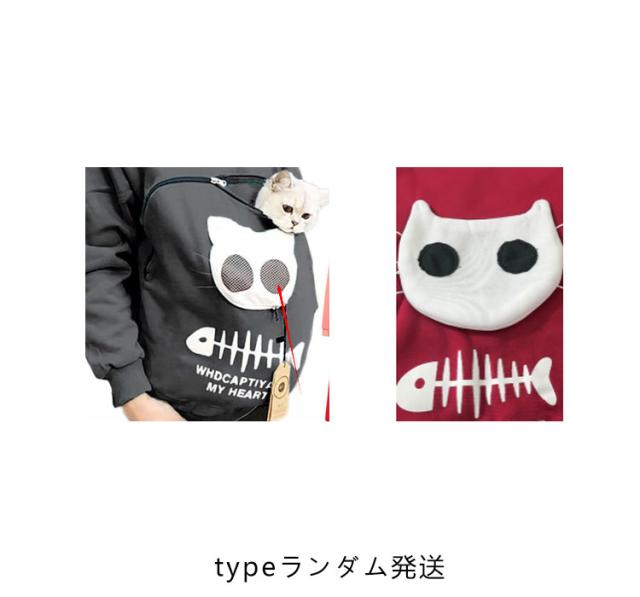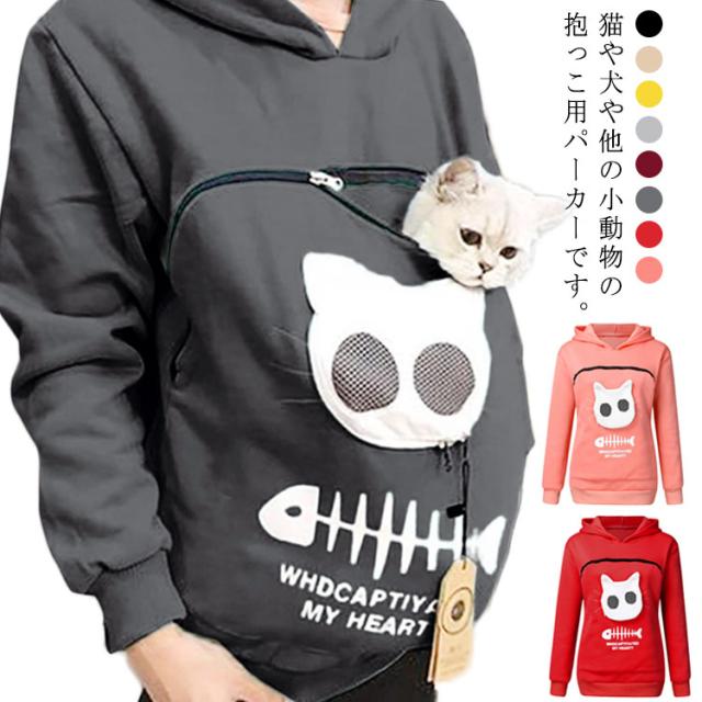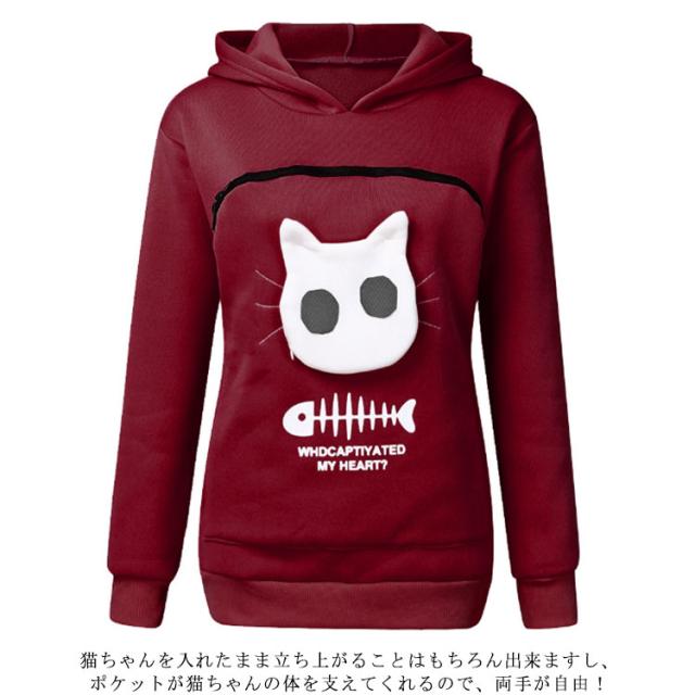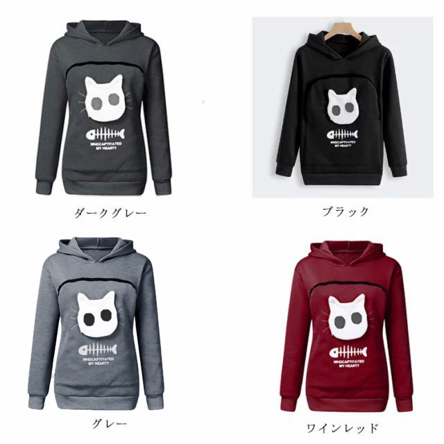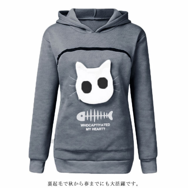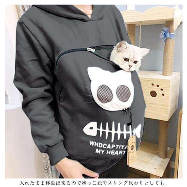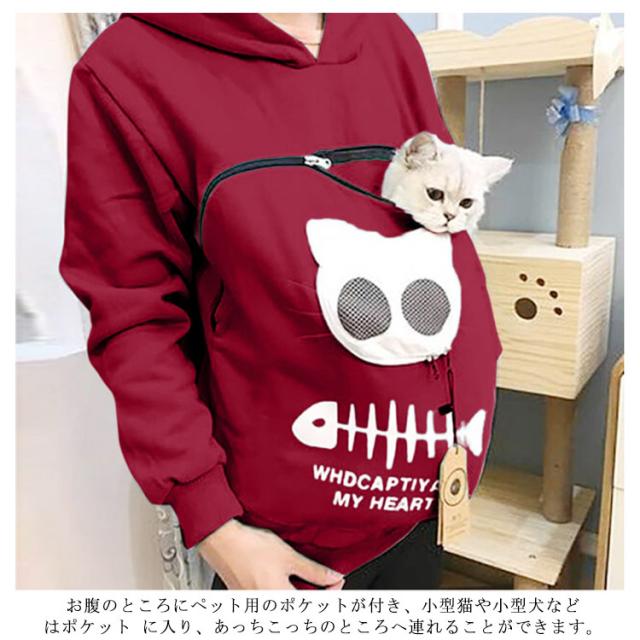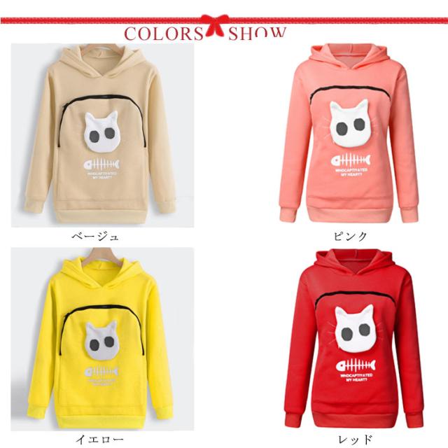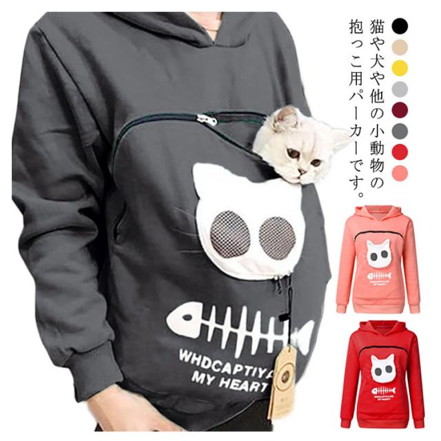 | 猫や犬や他の小動物の抱っこ用パーカーです。 お腹のところにペット用のポケットが付き、小型猫や小型犬などはポケット に入り、あっちこっちのところへ連れることができます。 猫顔の窓口からニャンコの可愛い顔が出すとすぐ癒されます。 入れたまま移動出来るので抱っこ紐やスリング代わりとしても。 猫ちゃんを入れたまま立ち上がることはもちろん出来ますし、ポケットが猫ちゃんの体を支えてくれるので、両手が自由! ペットホルダーポーチは、柔らかく、洗濯機で洗える。 裏起毛で秋から春までにも大活躍です。 大人でも学生でも適用されます。休日など普段着としてはもちろん、旅行やキャンプ、散歩などのアウトドア でも活躍しています。 | |