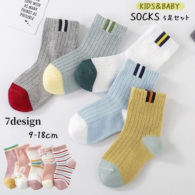 クルーソックス 靴下 5足セット キッズ ベビー 男の子 女の子 くつ下 ボーダー リブ ウサギ 通園 通学 かわいい おしゃれ