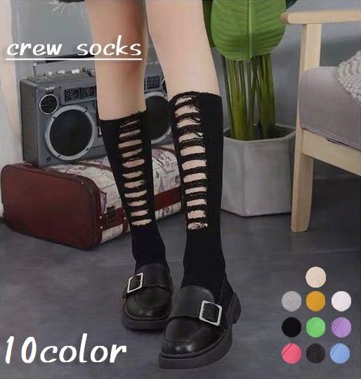 クルーソックス 靴下 レディース 女性用 ダメージ加工 穴あき リブ 黒 白 無地 単色 かわいい おしゃれ