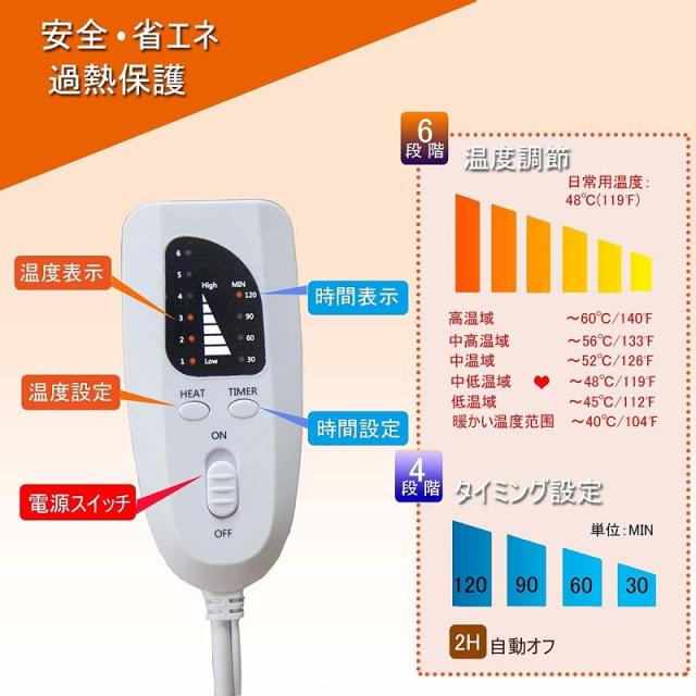 ★4段階のタイマー調節が可能です。(2H / 4H / 6H / 8H)温度設定機能・タイマー機能付き、設定した温度に達ち、過熱・電圧異常の場合は自動的に電源を切ります。PSE認証済み、生活防水仕様、過熱防止、感電防止、水漏れ防止の5つ安全設計により、いつもご安心してお使いいただけます。