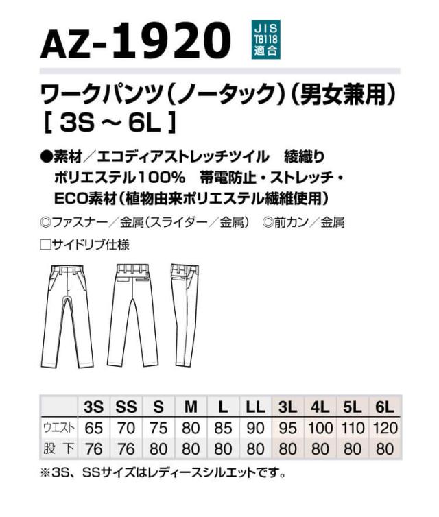 AITOZ アイトス ノータックワークパンツ AZ-1920 エコ素材 軽量 ストレッチ 帯電防止 秋冬 作業服 男女兼用 サイズ3S〜LL