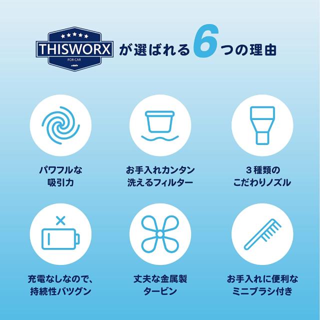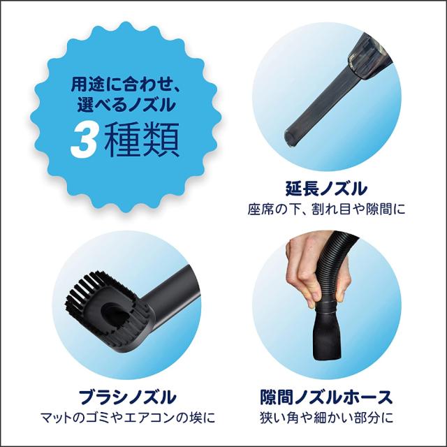 【付属品】車内清掃用3つのノズル(ブラシ+延長+隙間ノズル)、収納バッグ、クリーニングブラシ、予備のHEPAフィルターが付属。男性/女性に必須のカーアクセサリーです。このガジェットで車内を綺麗に保てます。